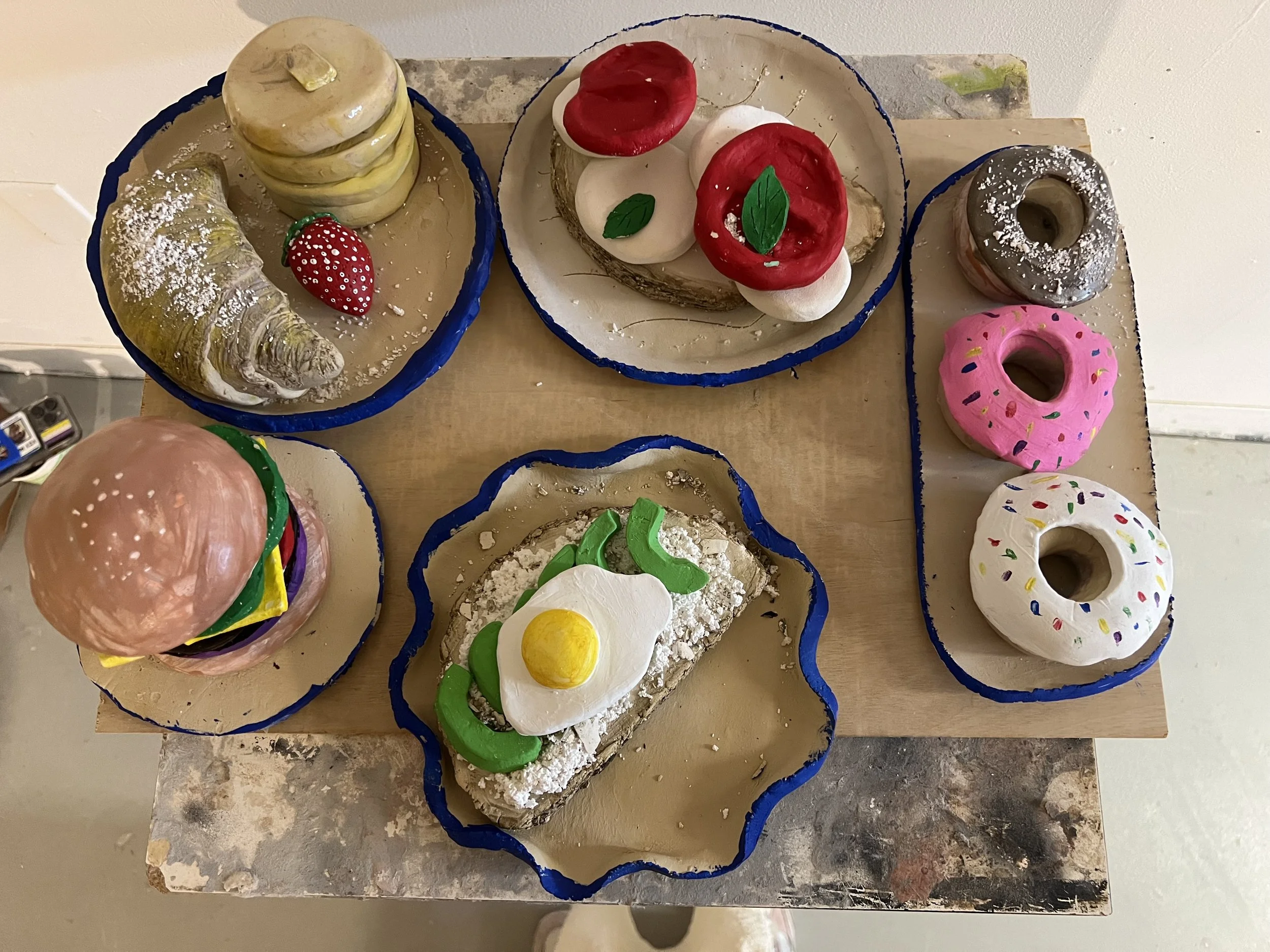 2. This is a clay sculpture food art featuring detailed representations of everyday foods.